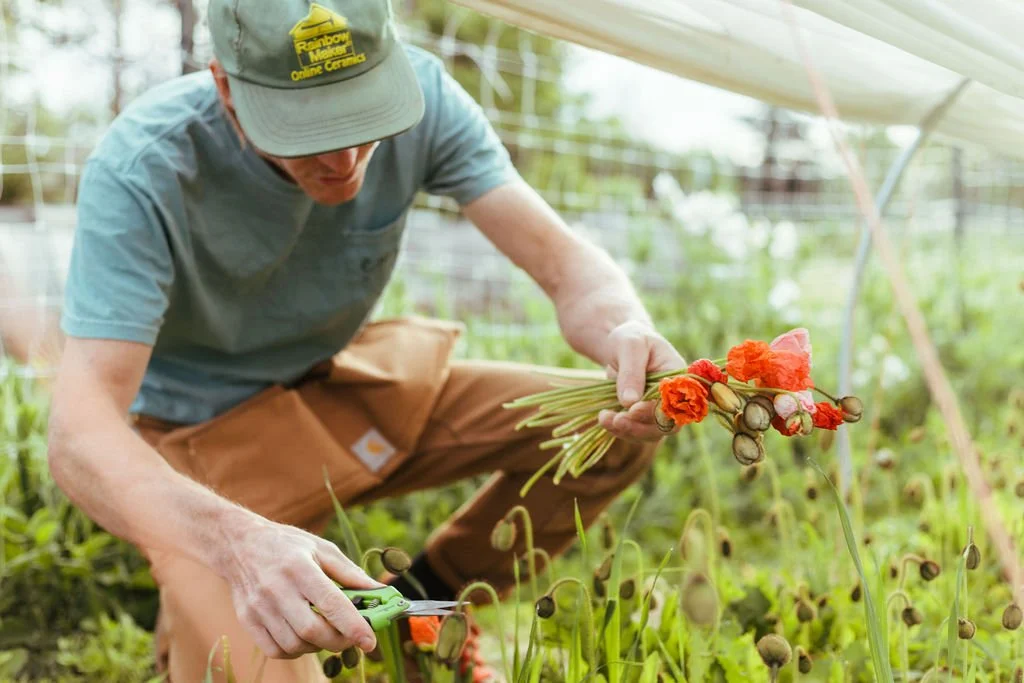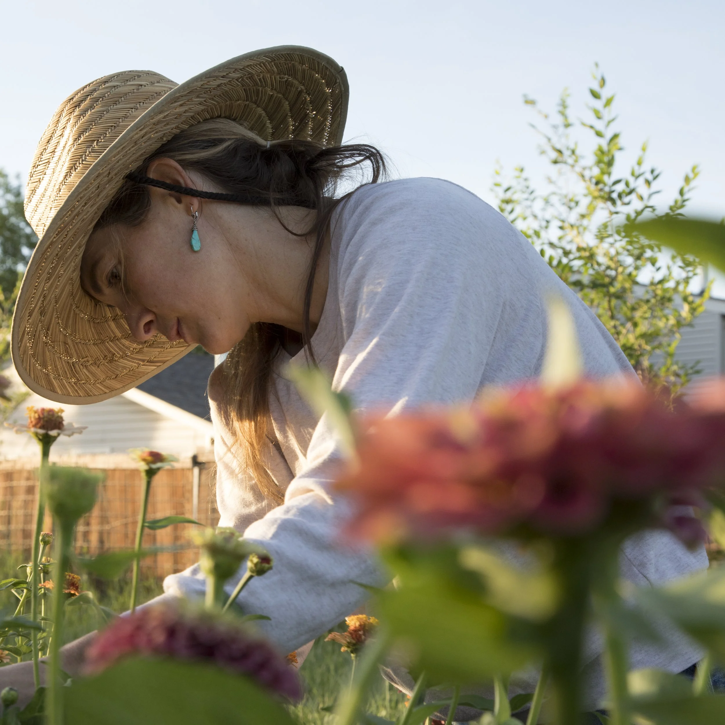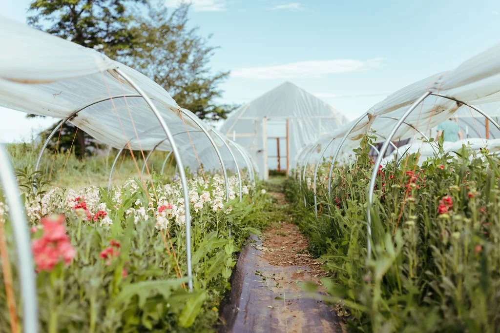 We know that farming does not always tread lightly on the land, and our goal is to critically consider the practices we apply. We grow our flowers organically, and we practice companion planting and integrated pest management. We implement water-wise irrigation techniques to reduce our water use, and we compost materials on site for re-use to amend our soils. We invest in the health of our soils through beneficial nutrients, cover cropping, and bed rotation. We actively limit our use of plastics and non-recyclable waste by starting seeds in soil blocks, switching to biodegradable netting, and eliminating packaging (or using compostable paper) for our products. We believe in progress over perfection and continue to examine and question how we can farm in a more efficient way and minimize our impacts.