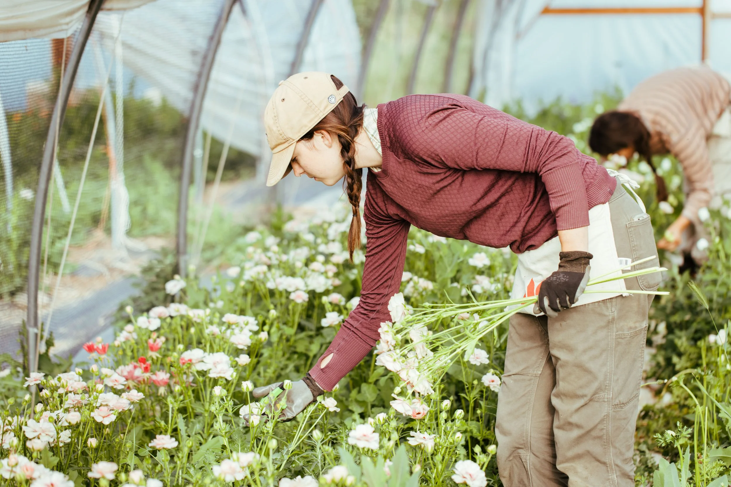 Season extention is a huge part of making farming viable in our climate. With abundant sunshine but extreme temperature swings, we take best advantage of our spring and fall shoulder seasons with protected growing areas including high tunnels, caterpillar tunnels, and frost cloth. We start most of our seeds in a heated and geothermally-regulated greenhouse (GAHT) with limited bed space for early and late rounds of specialty crops like ranunculus and heirloom chrysanthemums.